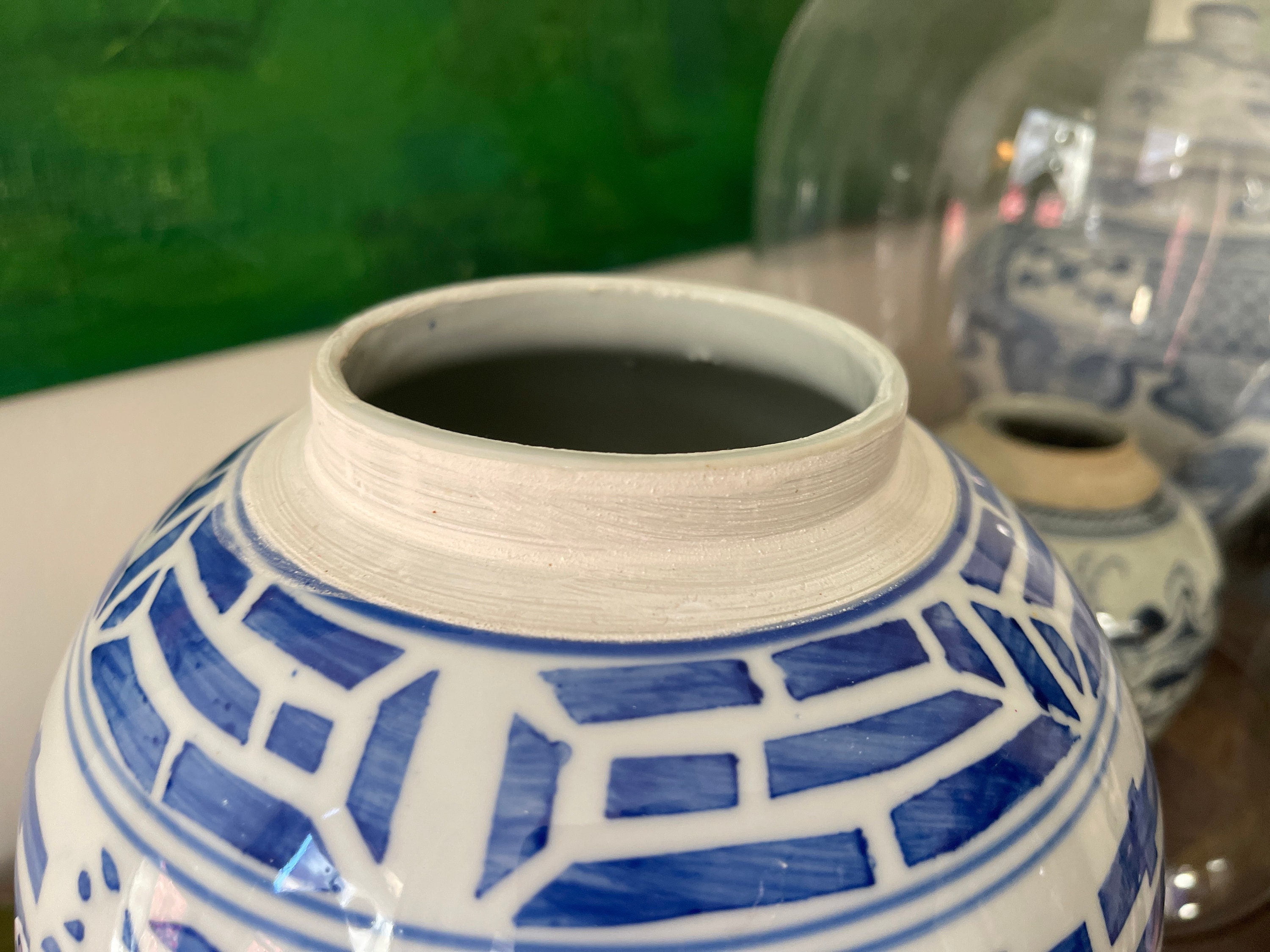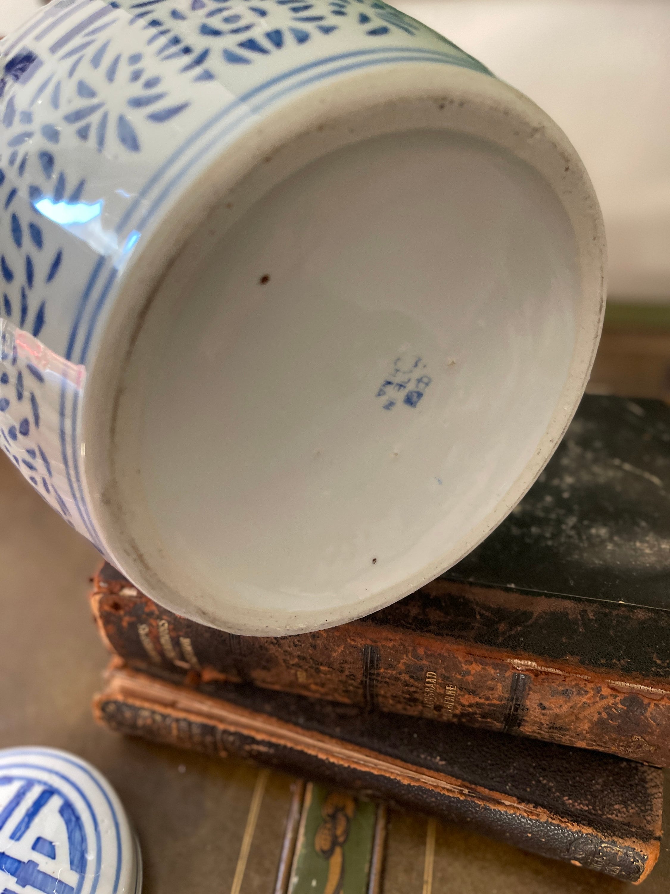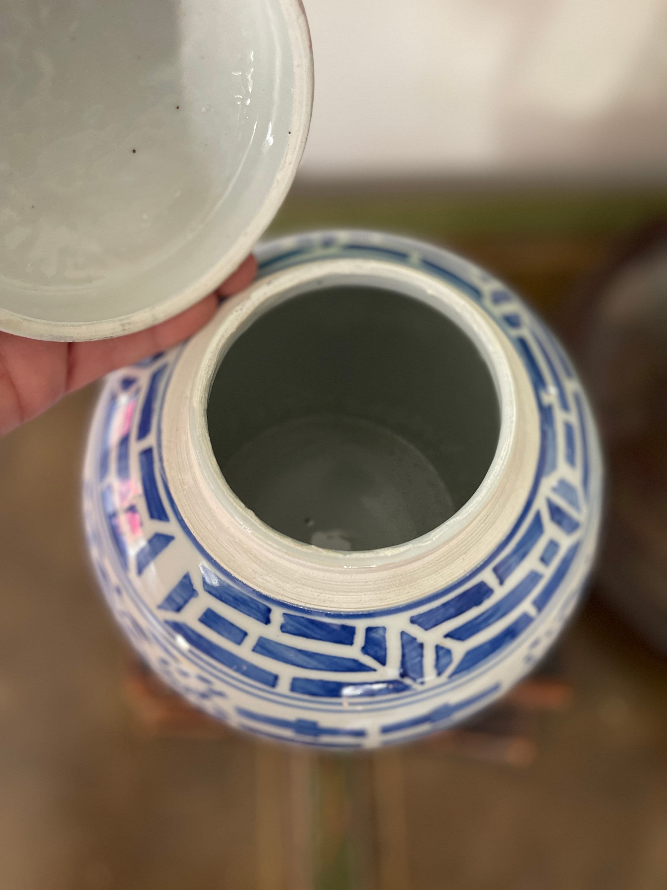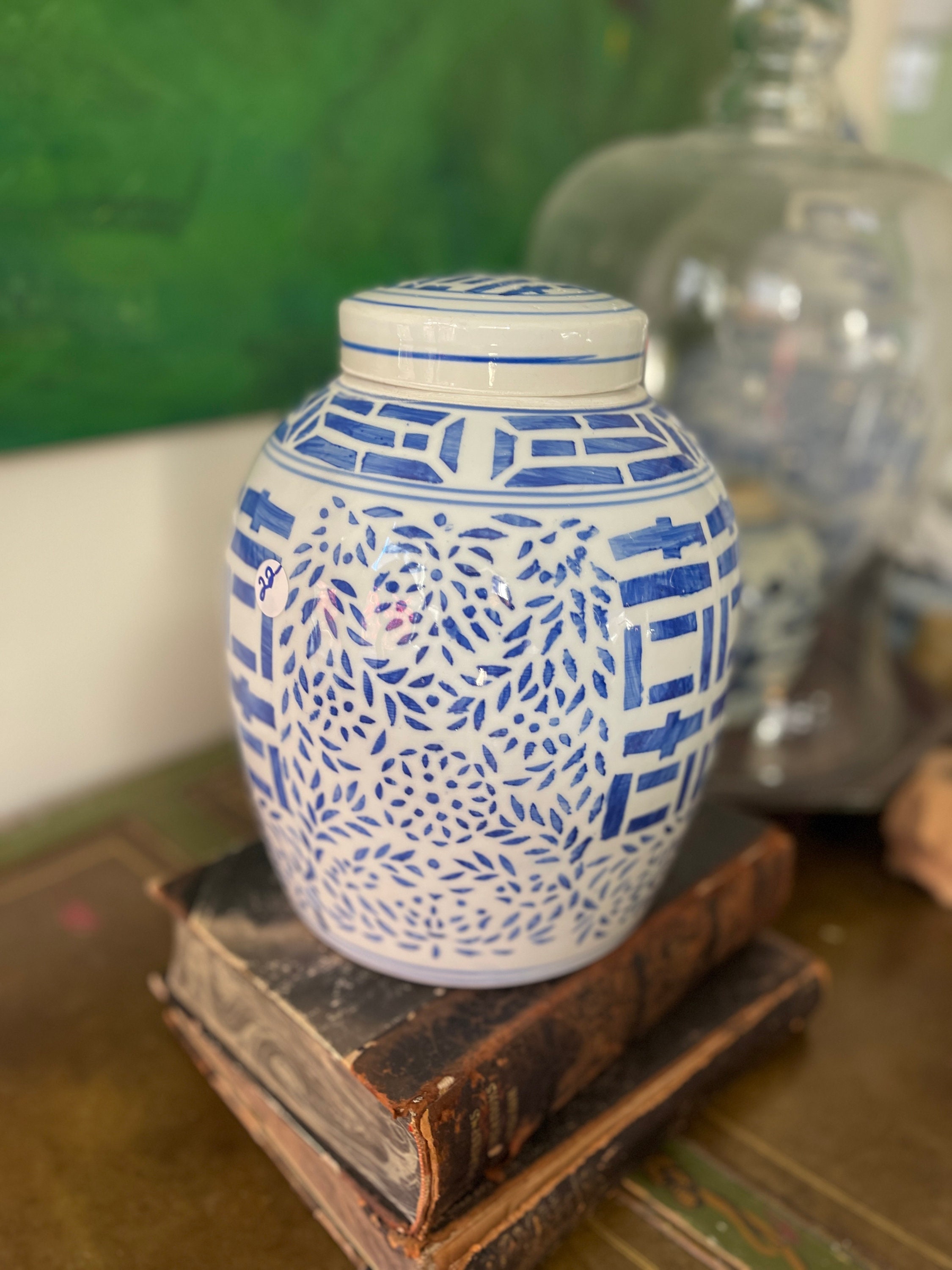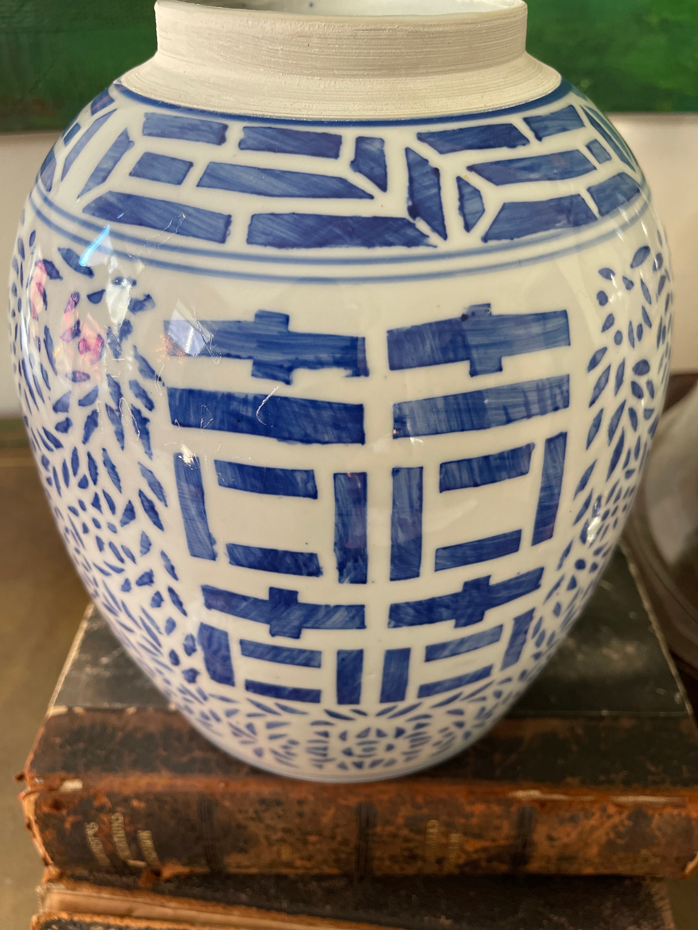 Wonderful, vintage double happiness, lidded jar, presented in a soft white with a rich, royal blue pattern, the double happiness symbol appears on the front, and the back with panels of floral and geometric in between and pattern repeats itself on the lid top. Slightly round body with a flattened lid, it looks great to set among a collection or to bring a bit of chinoiserie vibes into your home