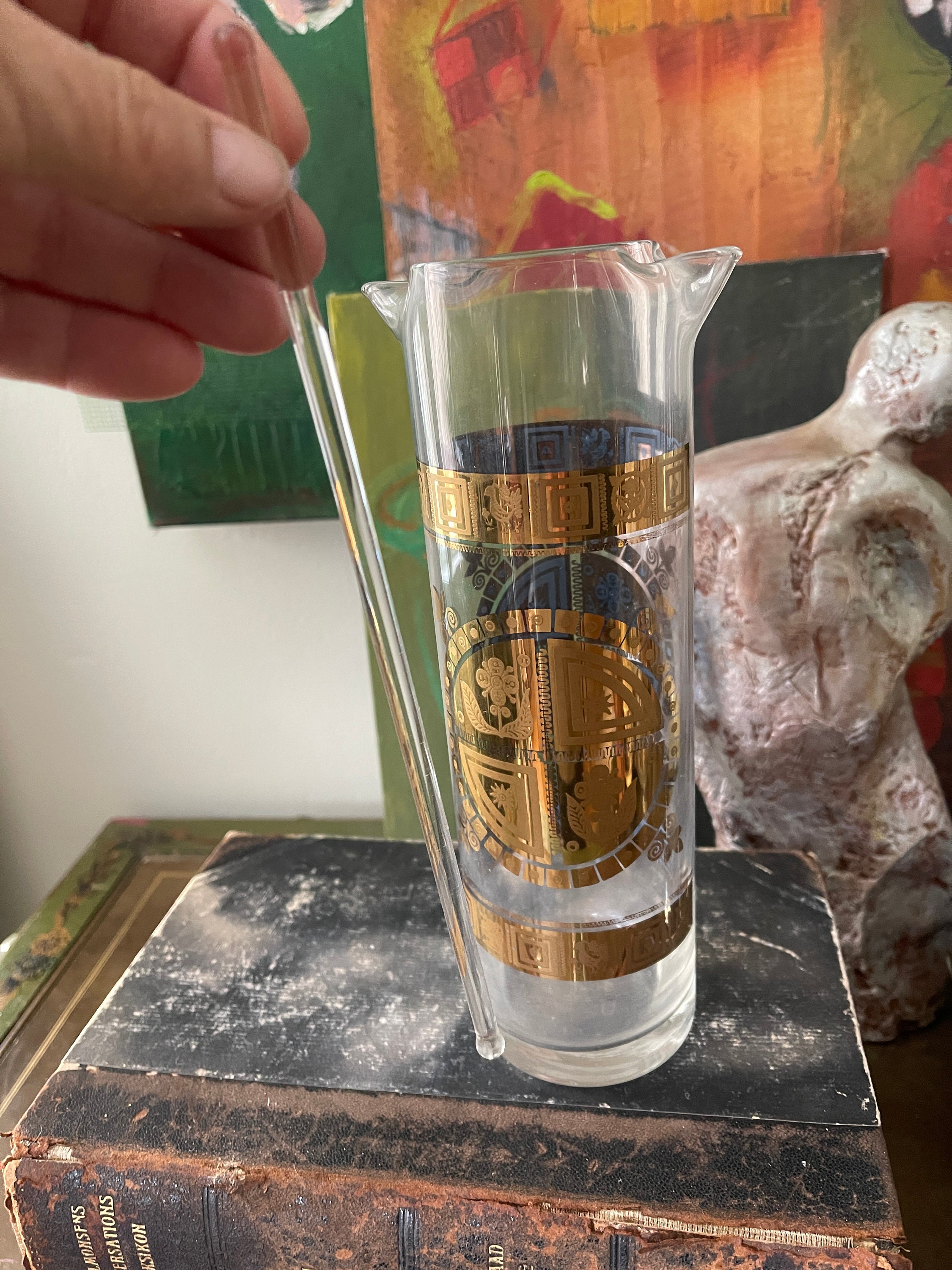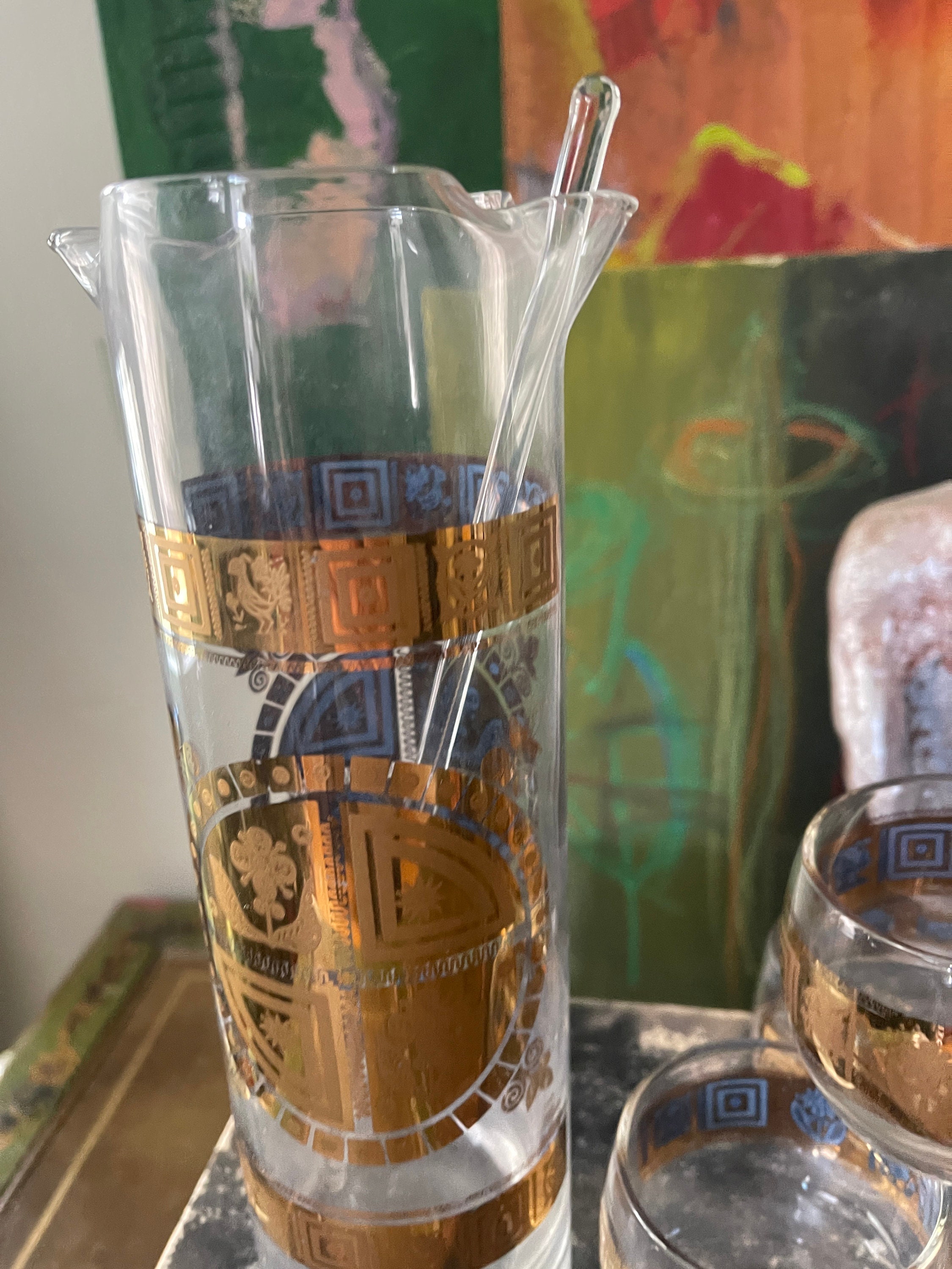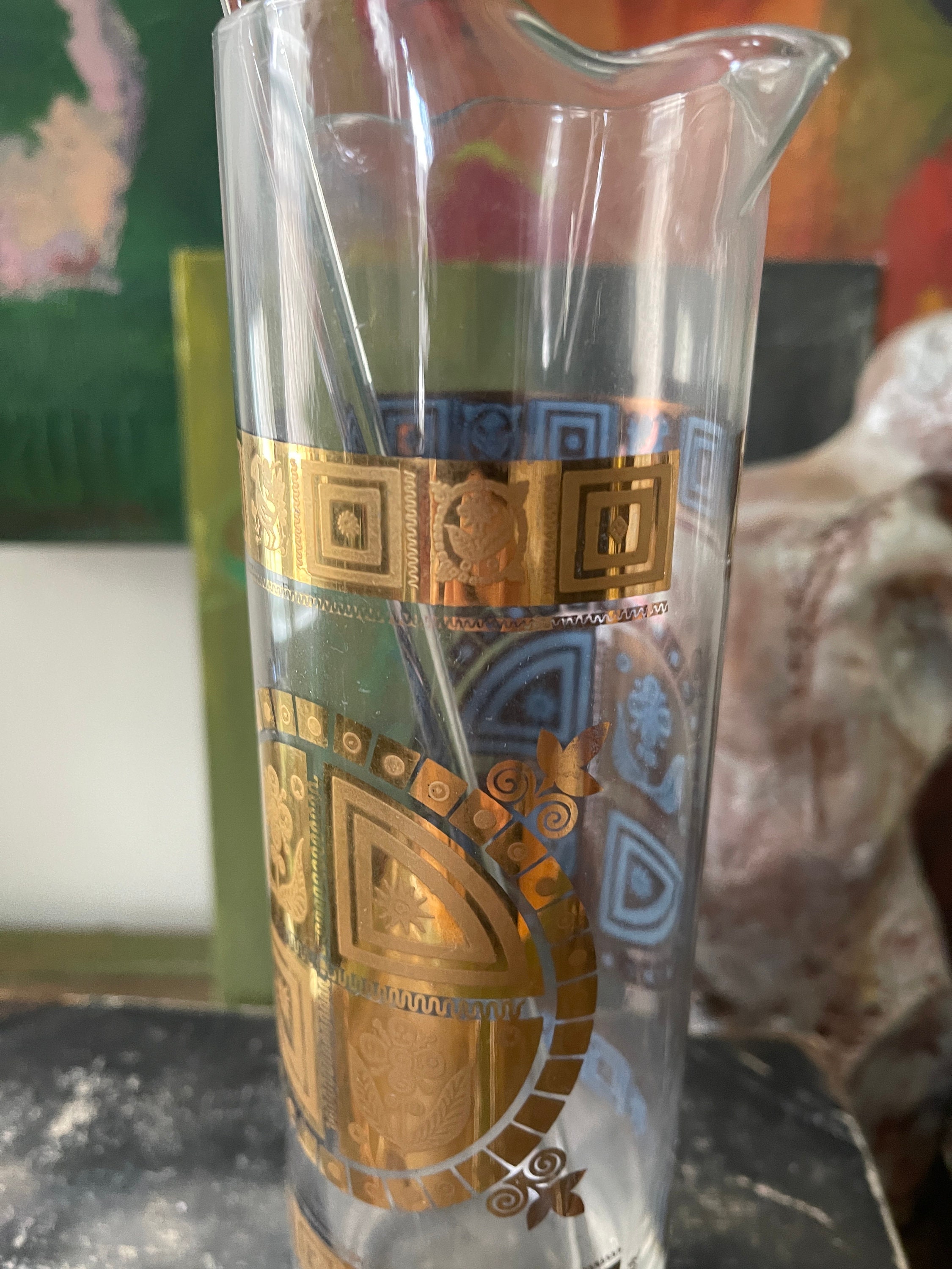 Wonderdul MCM Barware by Culver in Coronet, this set includes the Cocktail Pitcher with glass Swizzle Stick and four round low ball glasses. The picture is a double pourspouts, the sides of the pitcher and glasses are decorated with a fused 22 karat gold pattern that has an Aztec vibe. The glasses are signed Culver. This is a fantastic set to add to your bar cart for entertaining.