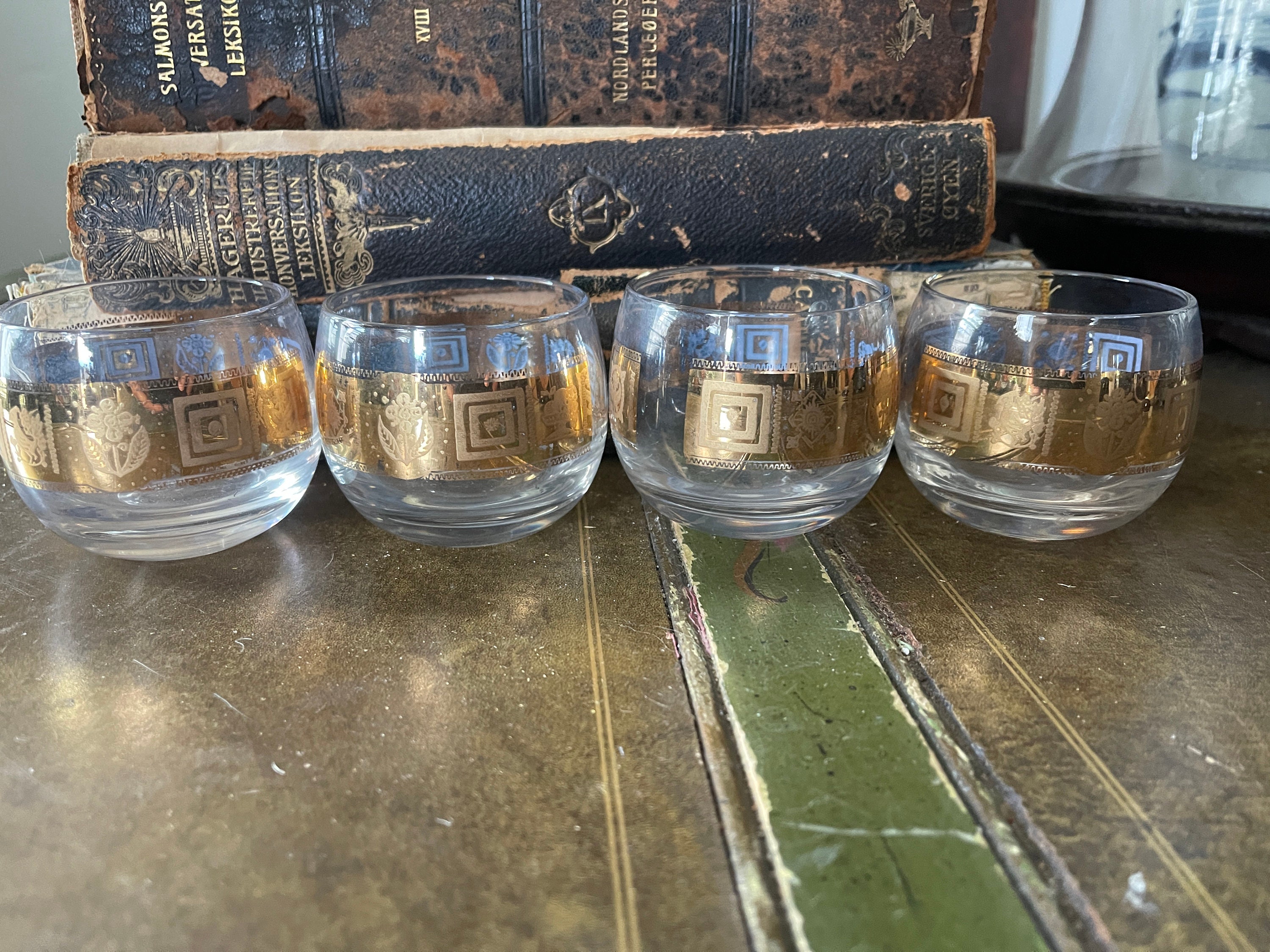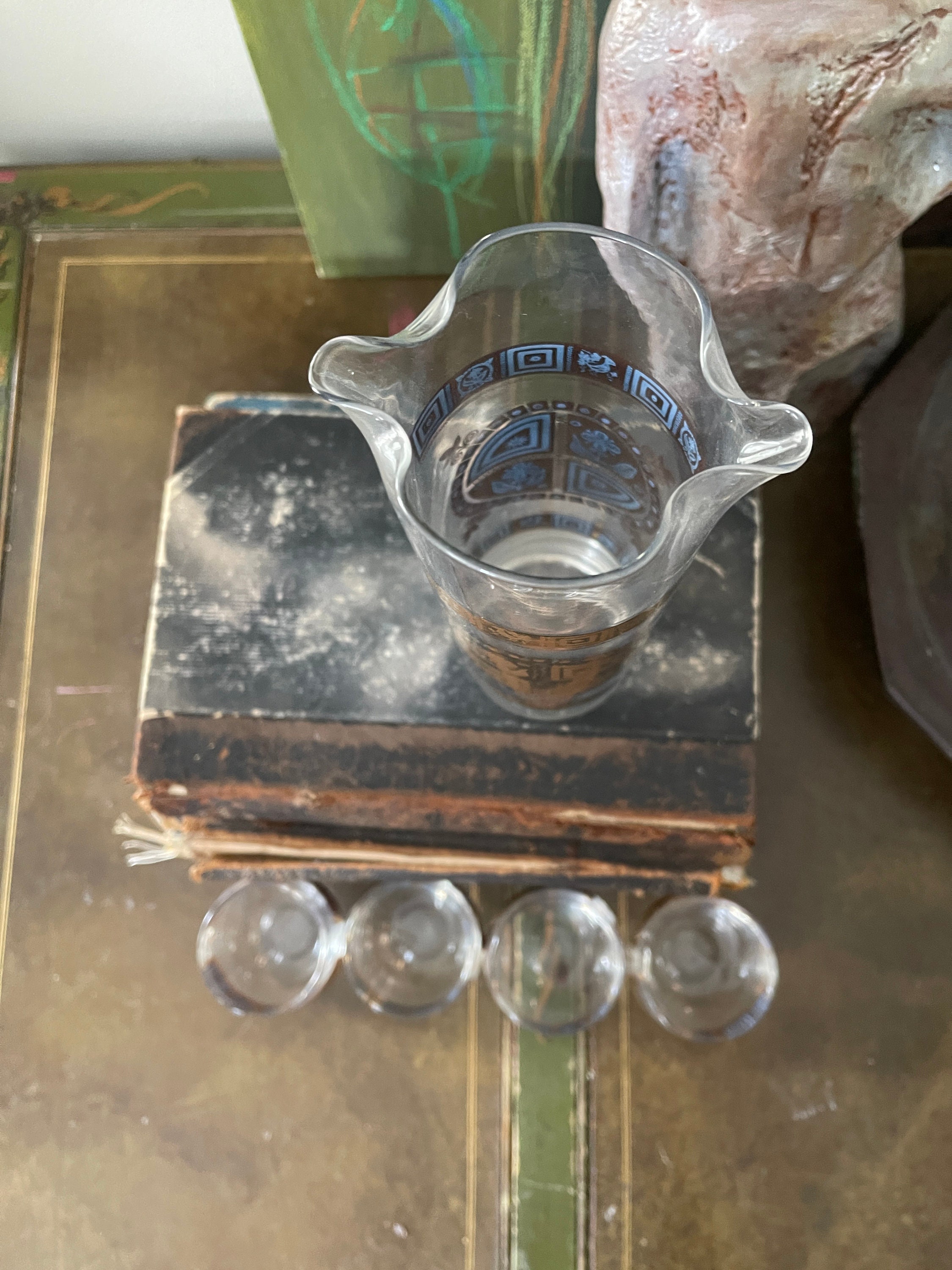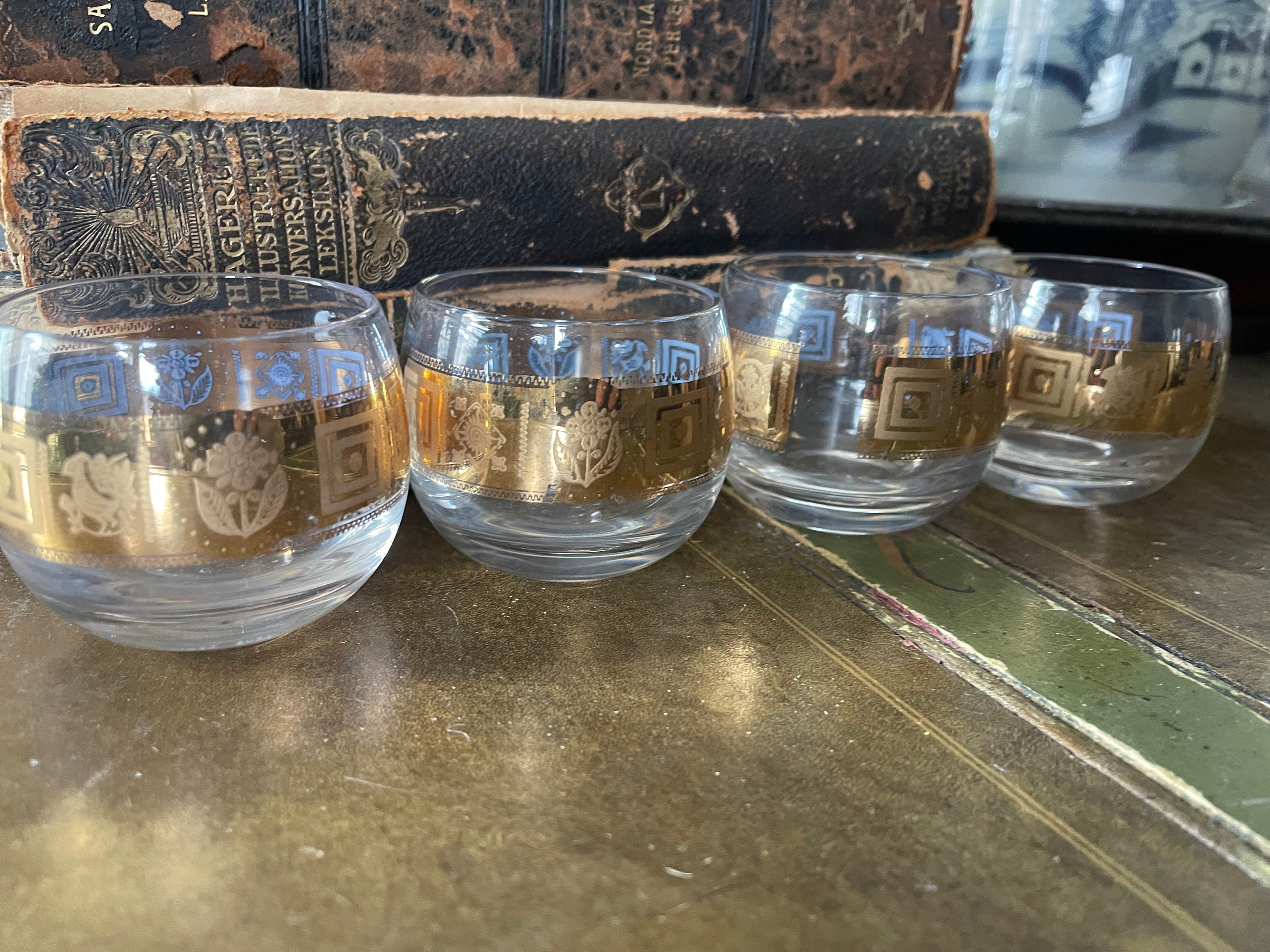 Wonderdul MCM Barware by Culver in Coronet, this set includes the Cocktail Pitcher with glass Swizzle Stick and four round low ball glasses. The picture is a double pourspouts, the sides of the pitcher and glasses are decorated with a fused 22 karat gold pattern that has an Aztec vibe. The glasses are signed Culver. This is a fantastic set to add to your bar cart for entertaining.