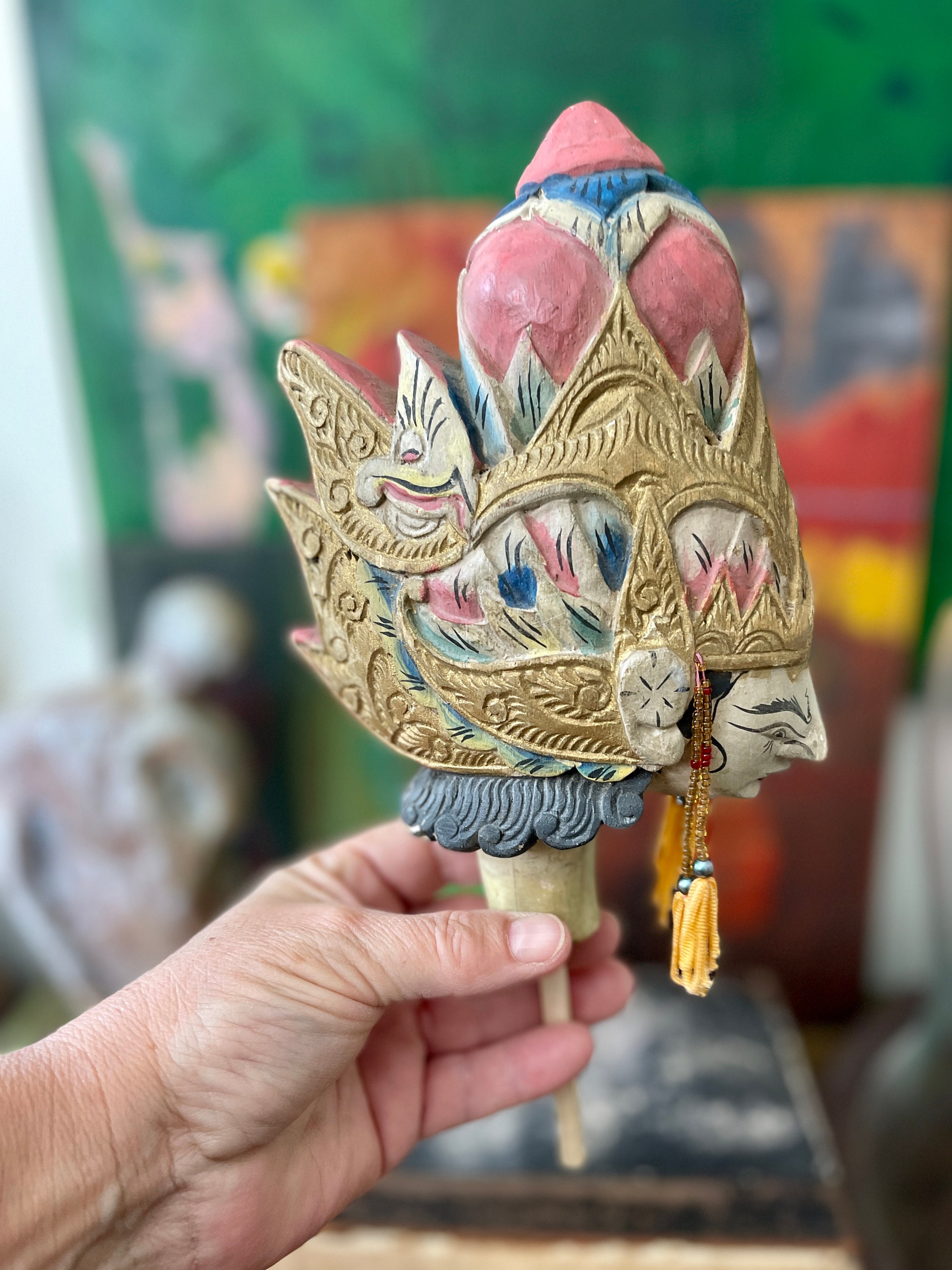 Fun and interesting, vintage, puppet head, this head depicts, a woman and traditional Indian attire, it is made from wood and has been hand painted. It likely set a top, a puppet at one point in time, as it has a hole in the underside of the base. It is a quirky piece that layers really well, whether you lay it on its side on a coffee table Tray or book stack, it also makes a cute stopper on a bottle