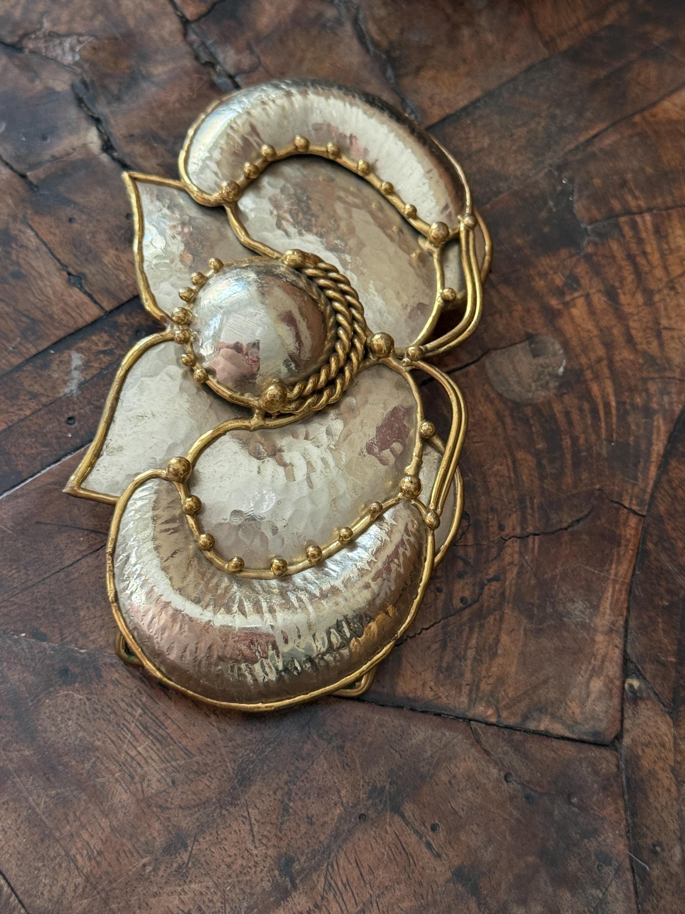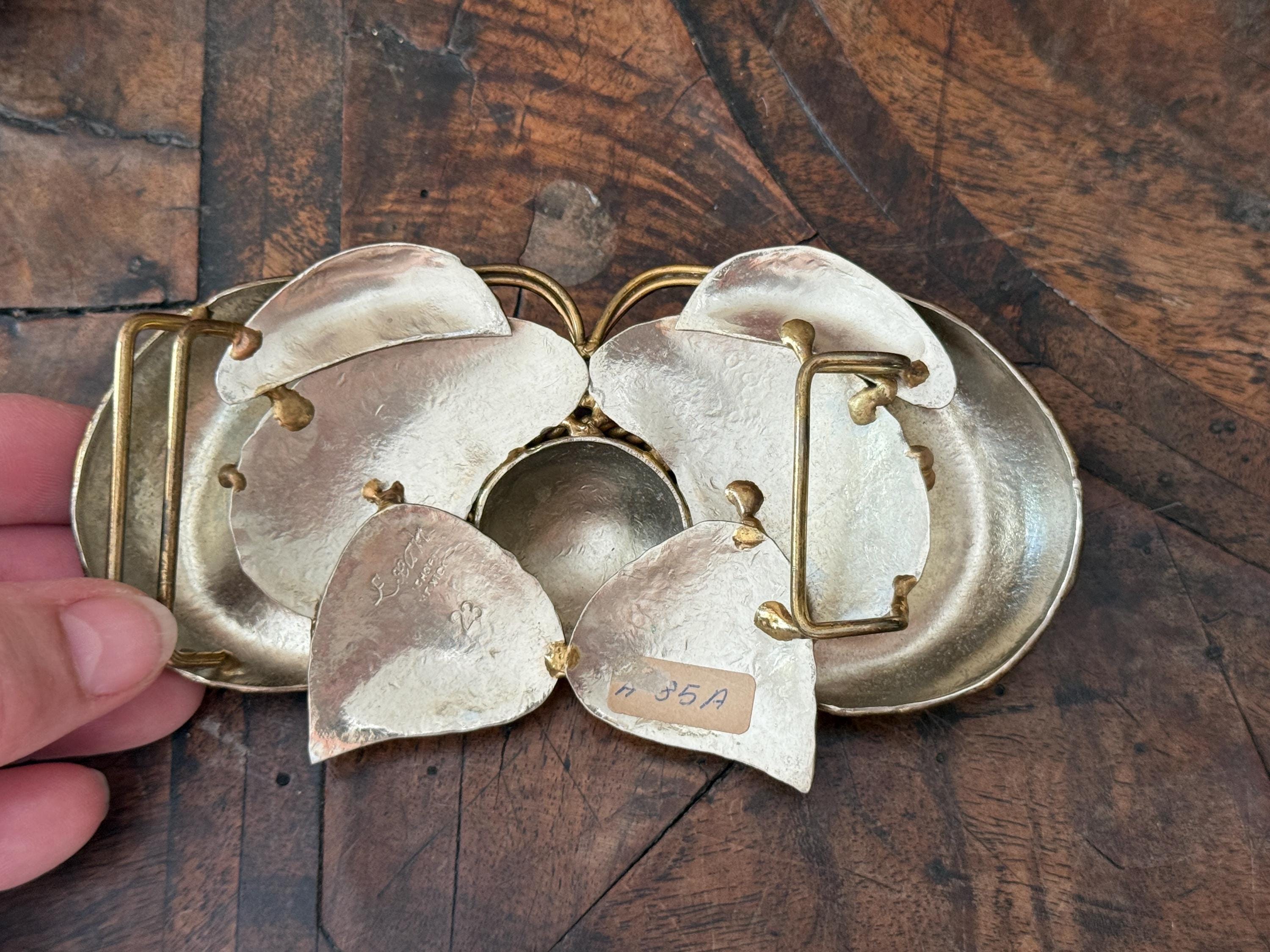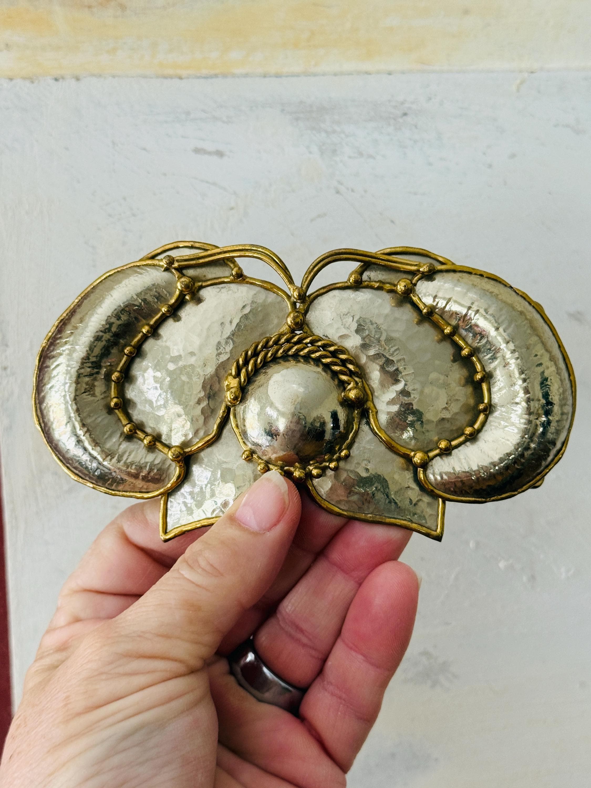 Wonderful hammered brass butterfly belt buckle, made by Exart in Mexico in the 1970s, this cool piece looks great wrapped around a dress or cardigan, bringing an instant layer of vintage boho vibe! Butterfly is a hammered brass edged in a rim of brass. Small round bead-like drops of brass decorate the wing edges and tips of antennae. Belt buckle can be connected to leather, metal or cloth belt. Perfect gift for holidays!