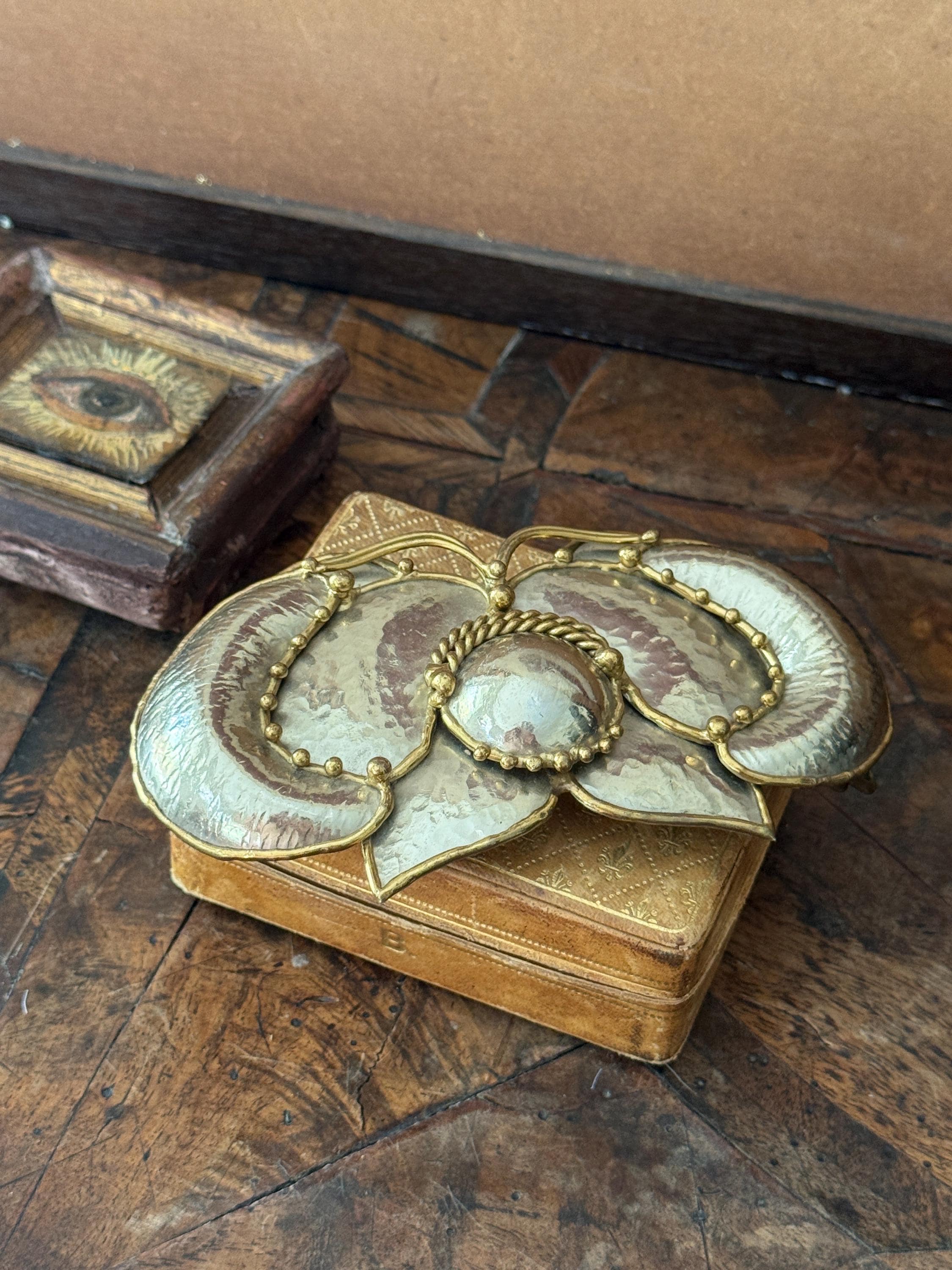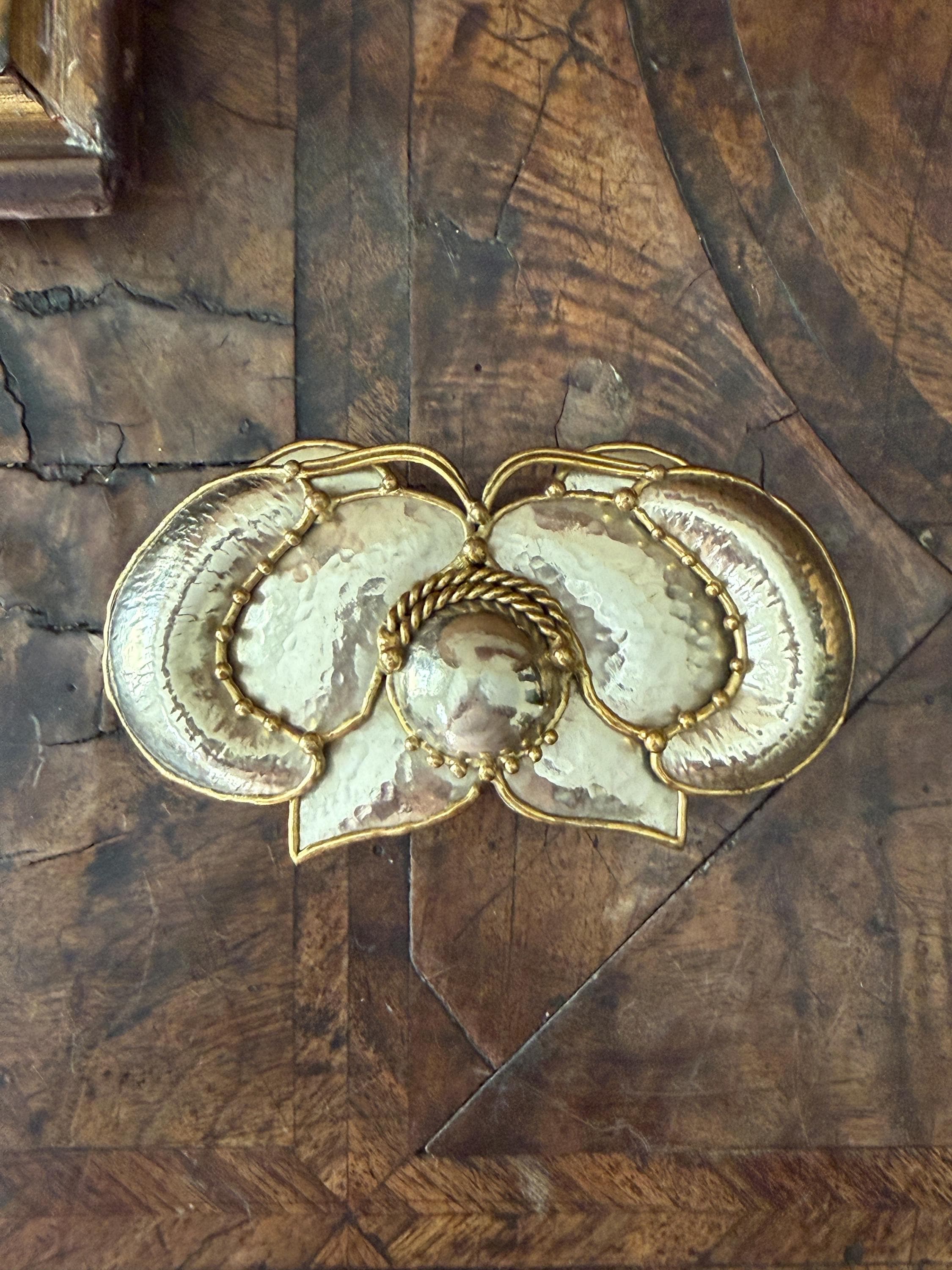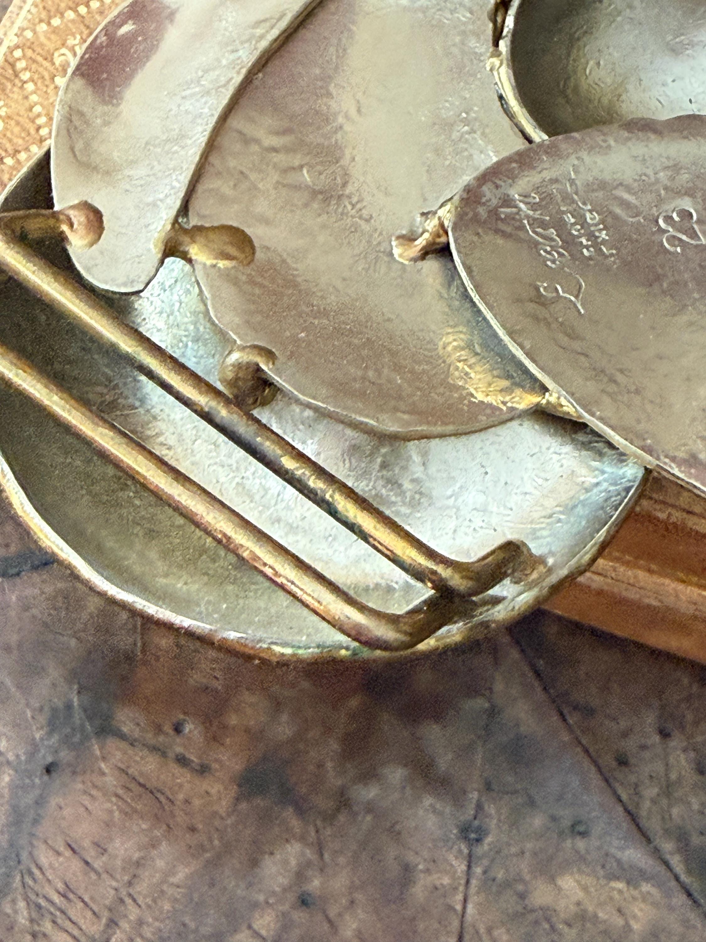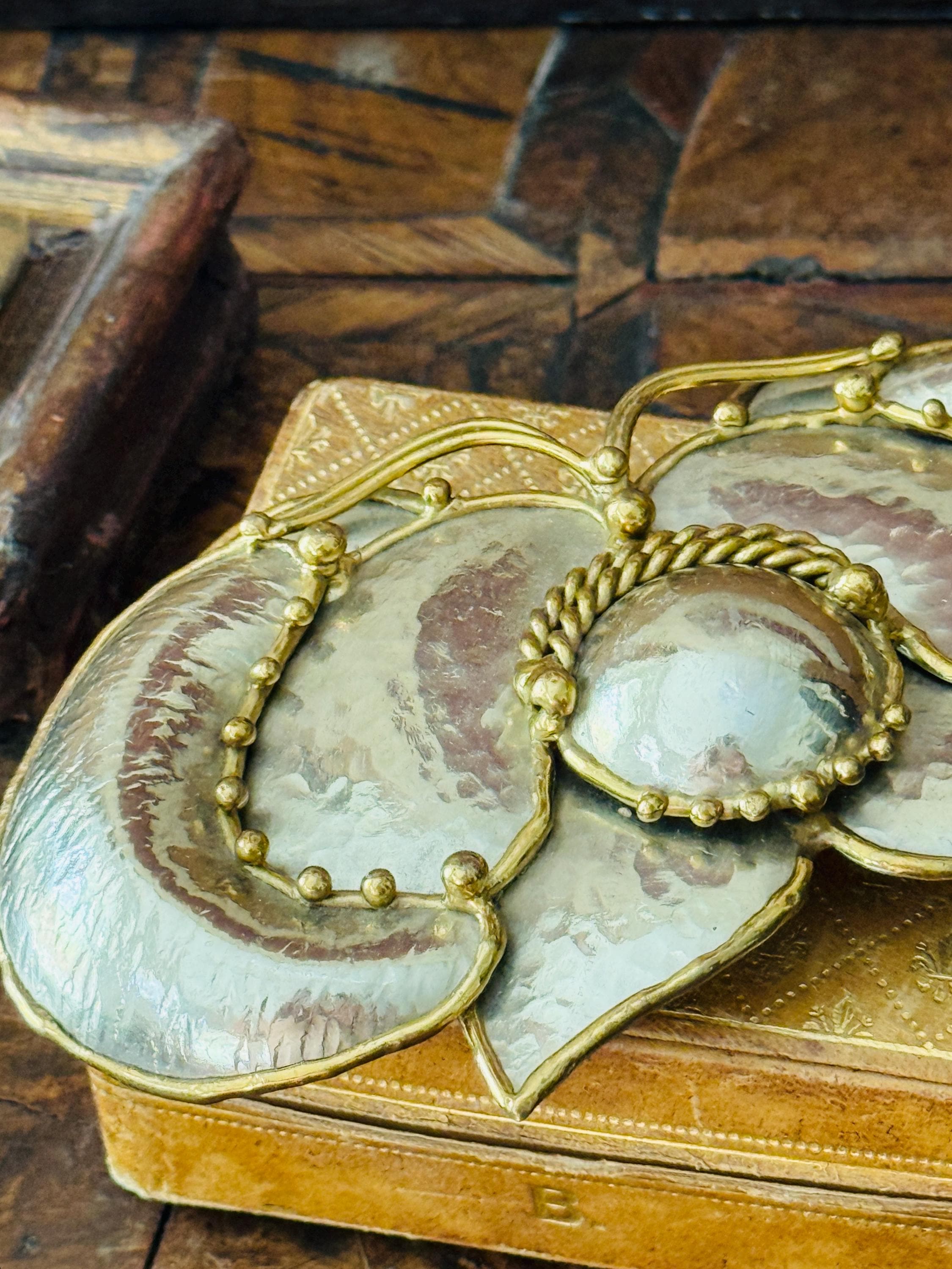 Wonderful hammered brass butterfly belt buckle, made by Exart in Mexico in the 1970s, this cool piece looks great wrapped around a dress or cardigan, bringing an instant layer of vintage boho vibe! Butterfly is a hammered brass edged in a rim of brass. Small round bead-like drops of brass decorate the wing edges and tips of antennae. Belt buckle can be connected to leather, metal or cloth belt. Perfect gift for holidays!